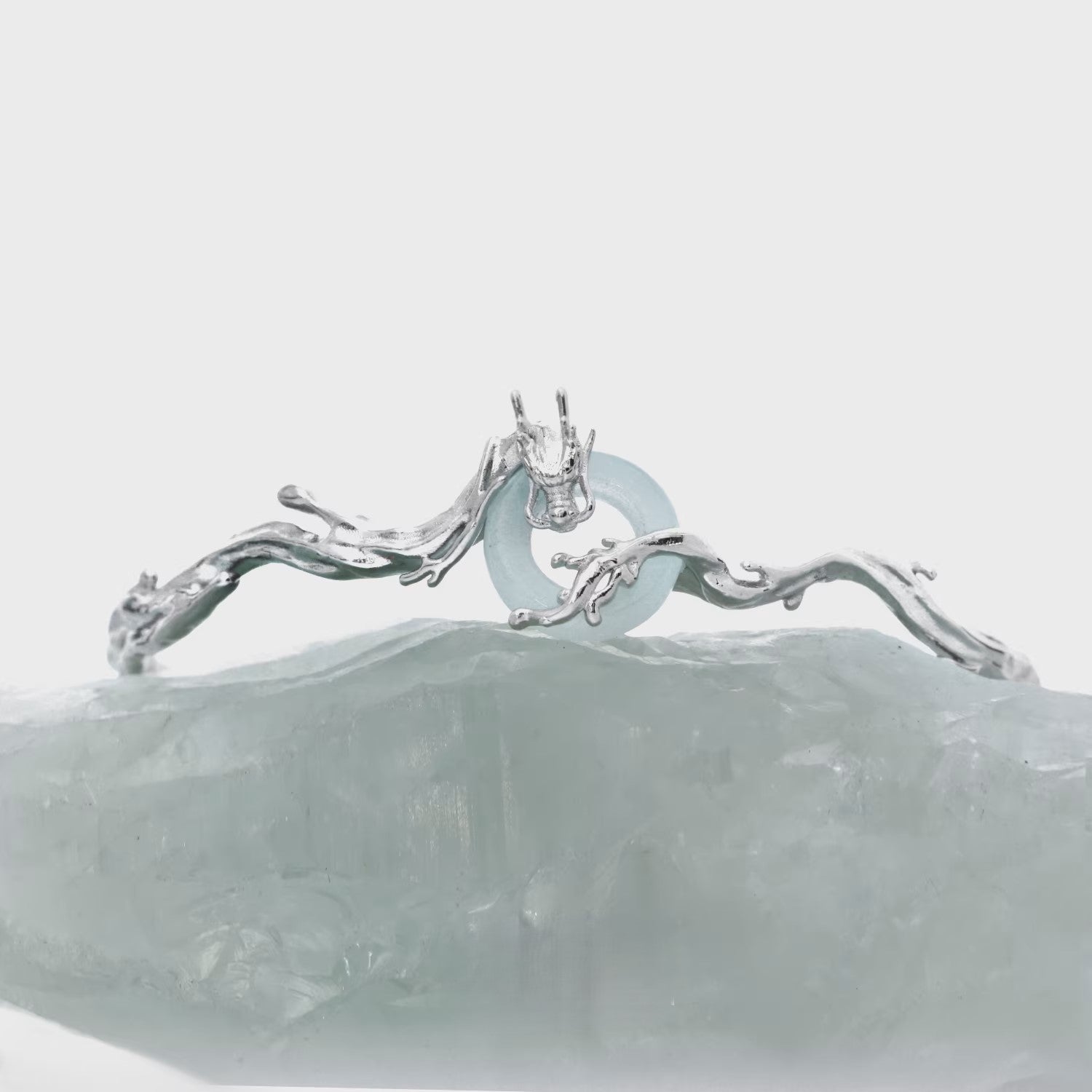 The dragon's unrestrained movement blends seamlessly with the icy, lustrous green of the jade.